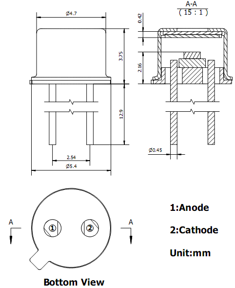 Silicon Avalanche Photodiode | APD-SI-905-0.5-TO46 | Spectral response range: 400-1100nm Peak response wavelength: 905nm Photosensitive surface diameter: 0.50mm Package: TO46 |