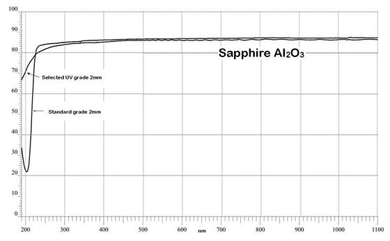 Sapphire (Al2O3) is highly regarded for its extreme toughness and strength, making it an ideal material for optical windows across the UV, VIS, and NIR spectral ranges. Sapphire can be grown using different methods. The Verneuil and Czochralski processes are commonly used for standard-grade sapphire materials. Higher-quality sapphire, used for electronic substrates, is typically grown by the Kyropulos method, offering exceptionally high purity and excellent UV transmission properties. In the IR spectrum, sapphire's use is generally limited to around 5μm, with few issues encountered at optical grades. In the UV range, care must be taken when observing its transmission from 140nm to 240nm, as it is highly sensitive to impurities and voids. Large sapphire crystals can be made by color-band growth. Sapphire exhibits slight birefringence, and IR windows are typically cut randomly from the crystal. For specific birefringence applications, an orientation can be selected, where the optical axis is at a 90-degree angle to the surface, referred to as "zero-degree" material. Synthetic optical sapphire is colorless. *Note: Actual thermal expansion values may vary across manufacturers.